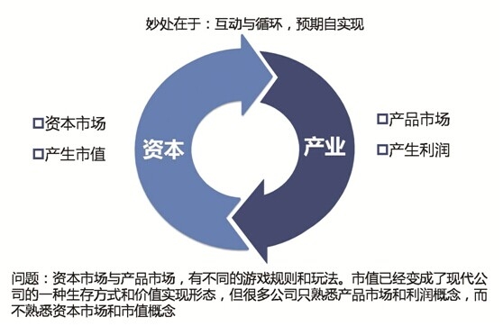 任何一家上市公司都是在兩個(gè)市場進(jìn)行經(jīng)營,第一個(gè)市場是資本市場,這個(gè)市場的經(jīng)營目標(biāo)是市值。第二個(gè)市場是產(chǎn)品市場,這個(gè)市場經(jīng)營目標(biāo)的核心是利潤。實(shí)際上我們了解很多上市公司更多的是在右邊,就是產(chǎn)品市場。每天供研產(chǎn)銷思考的是利潤問題,很少有上市公司能夠有左邊這套思維,更少有上市公司能夠把這兩種思維有效地融合。